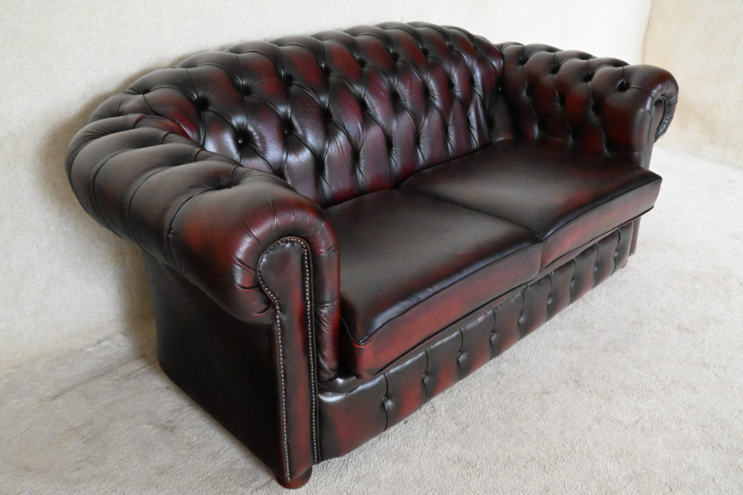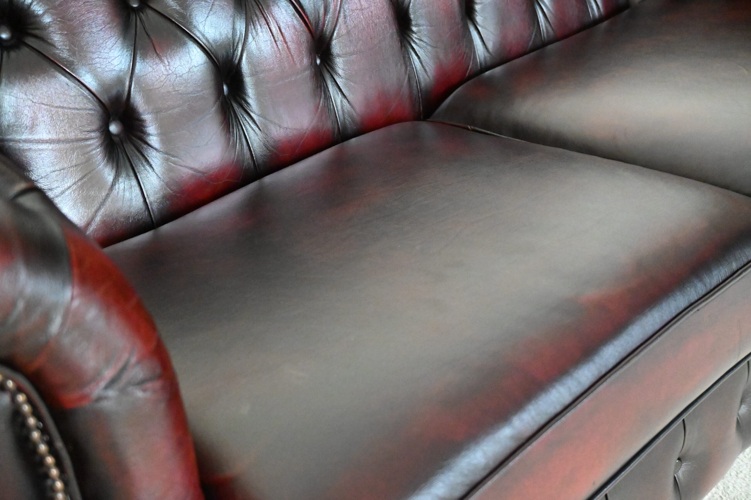 Garantie tweedehands chesterfield: 3 jaar op frame/constructie, 6 maanden op leder, niet op stof. Kussentops uitgesloten