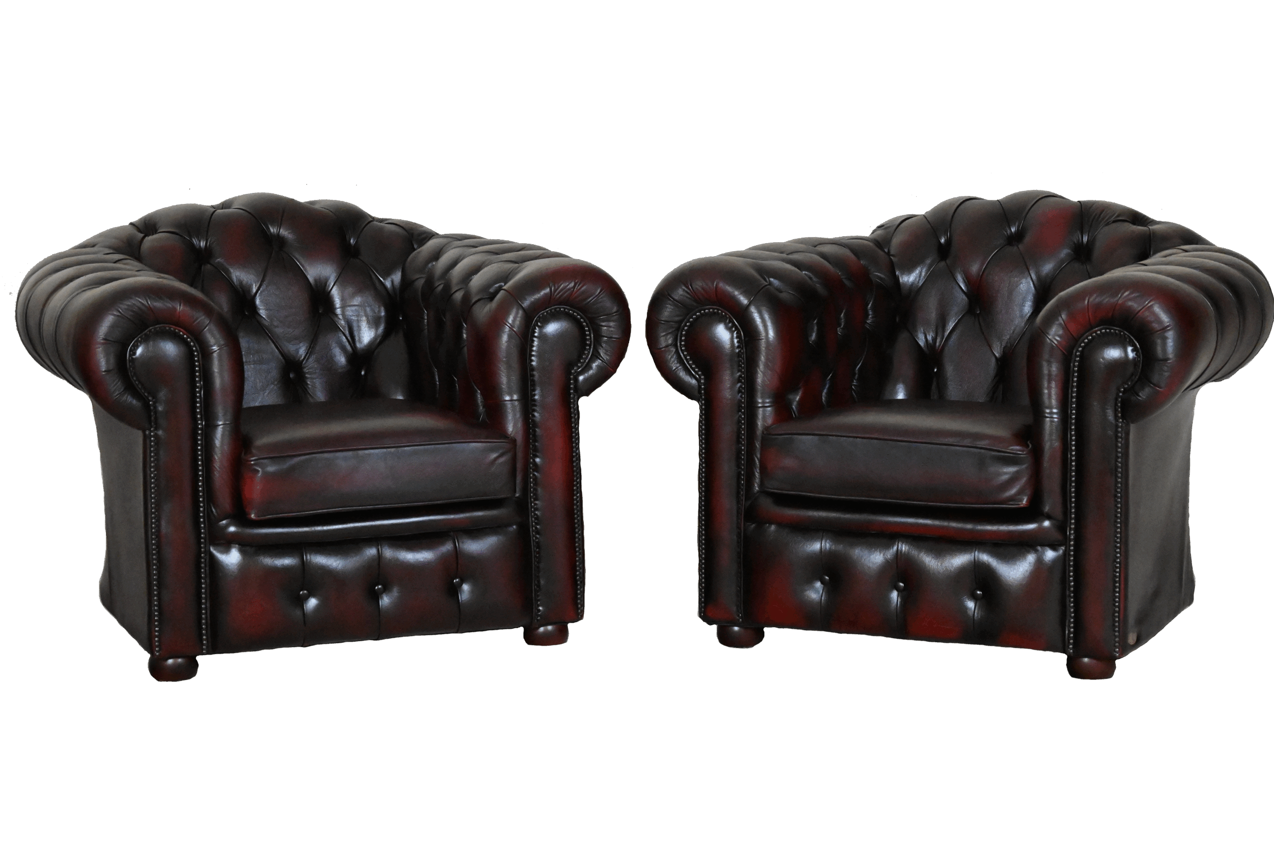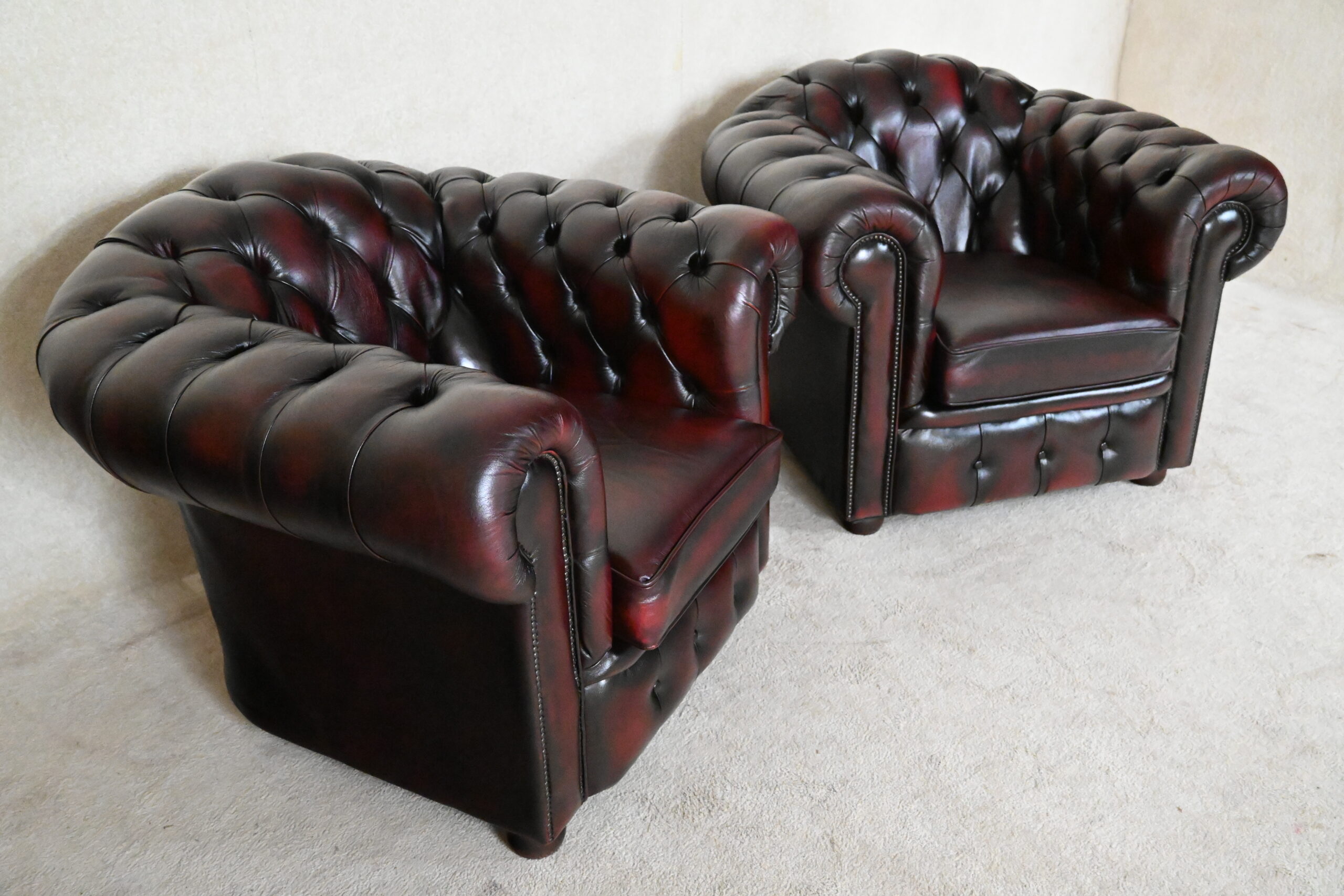 Deze heel robuuste Full-Size Chesterfield model Highlander is nog steeds in onze collectie en heel gewild. Deze set is ingeruild bij de verkoop van een nieuwe set in dezelfde kleur, samenstelling en uitvoering. De wat hogere medium rugleuning biedt een goede ondersteuning. De zitkussens geven een medium tot zacht zitcomfort. De biezen en bovenzijde van alle zitkussens zijn vernieuwd. Deze set verkeert in heel goede staat. Met garantie.